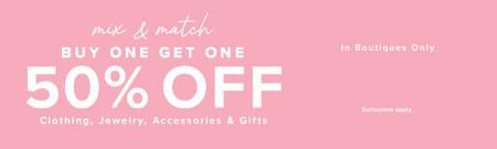 Buy One, Get One 50% off Clothing, Jewelry, Accessories and Gifts